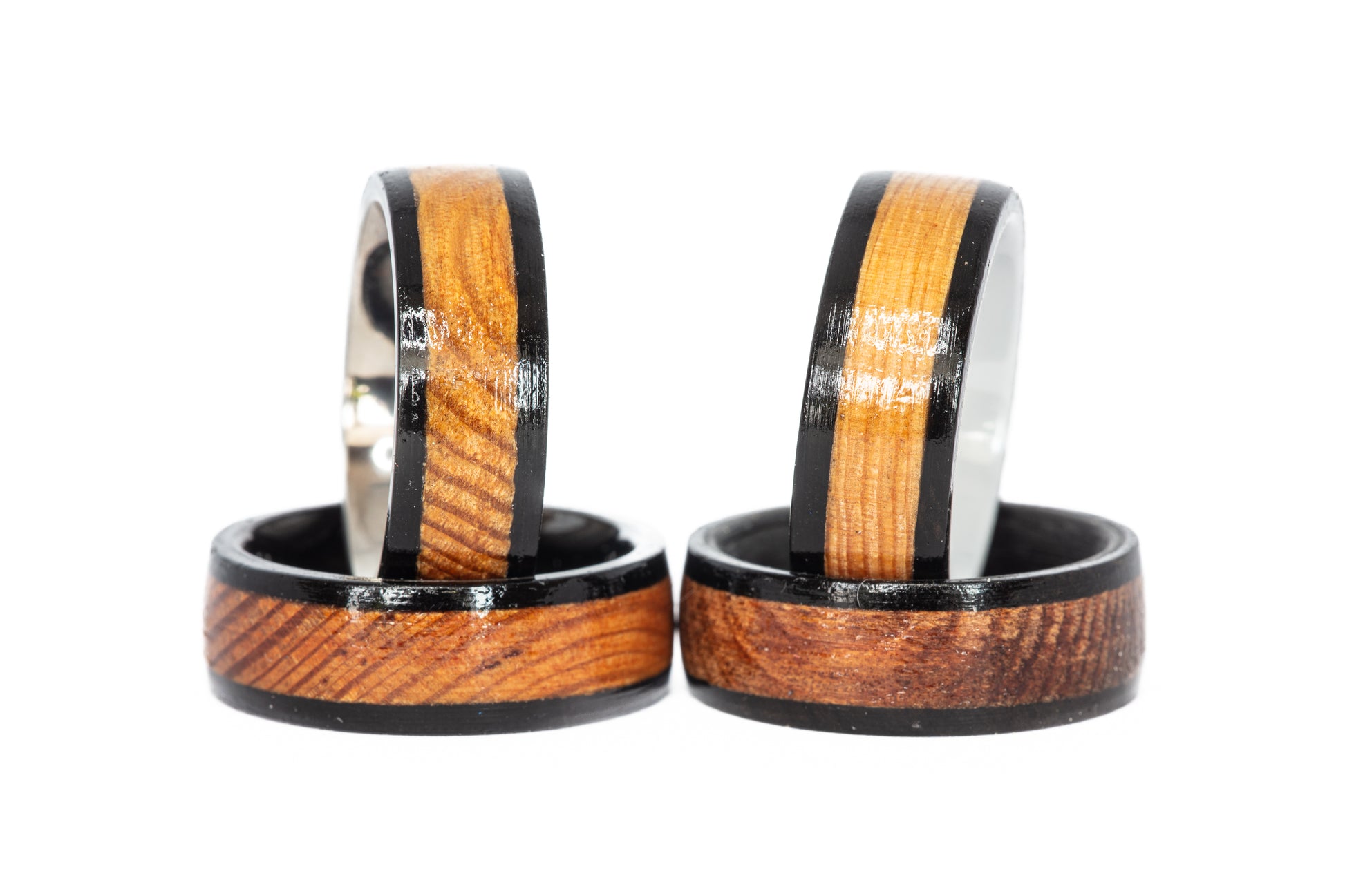 Each ring is delivered in a custom wooden ring box with a hinged, magnetic closure. The inside lid of the box is engraved with the origin of the wood used for the ring. Each ring also comes with a dated certificate of authenticity with individual serial identification numbers to prove the unique origin of the material used for your ring!