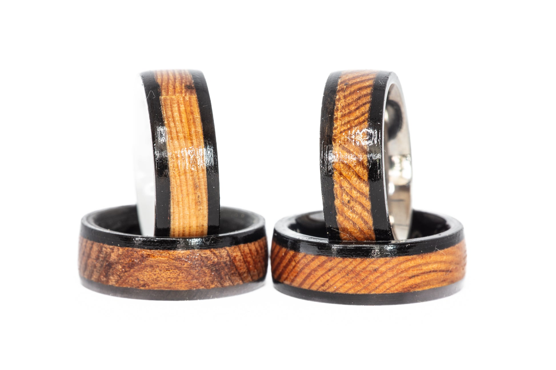 Each ring is delivered in a custom wooden ring box with a hinged, magnetic closure. The inside lid of the box is engraved with the origin of the wood used for the ring. Each ring also comes with a dated certificate of authenticity with individual serial identification numbers to prove the unique origin of the material used for your ring!