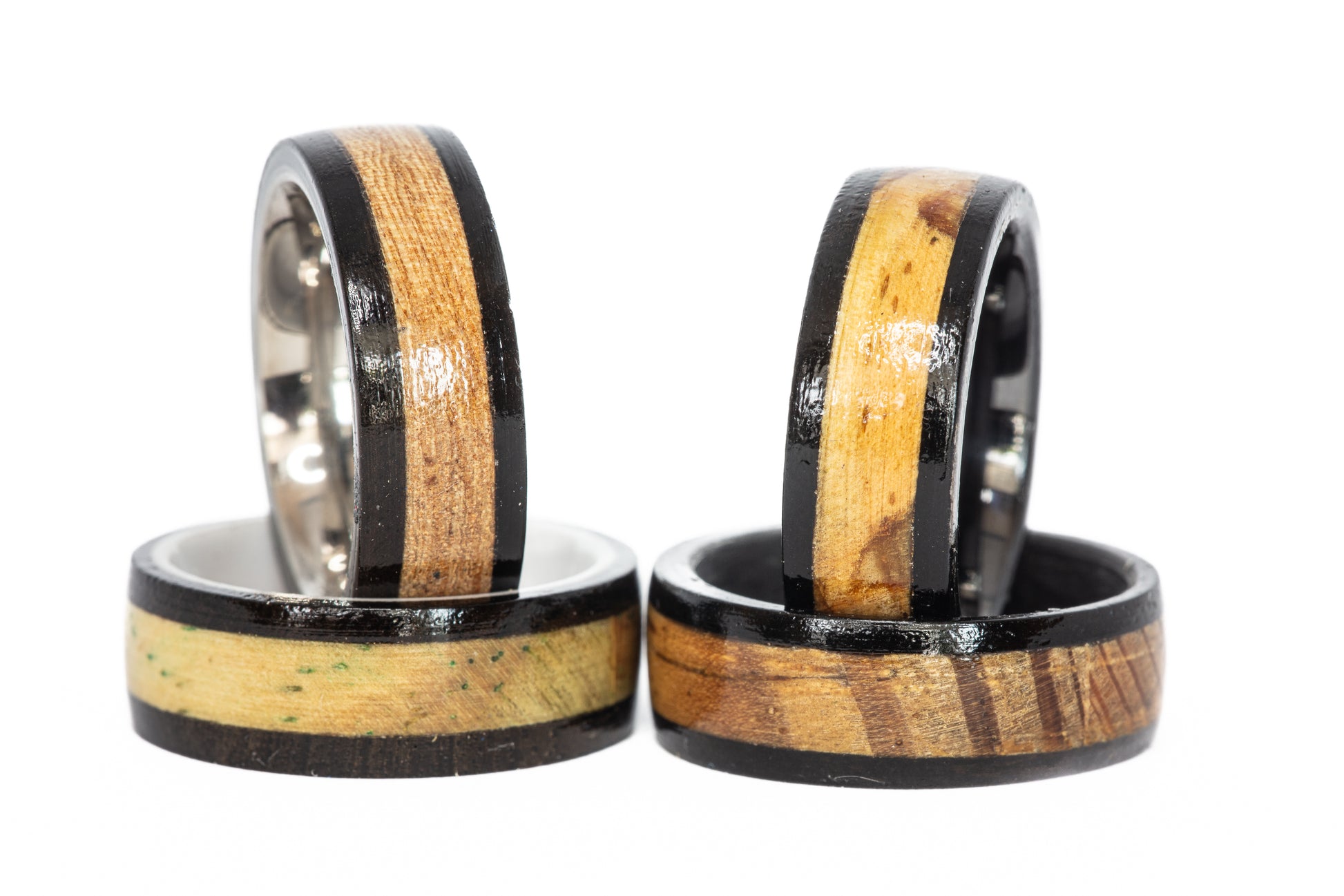 Each ring is delivered in a custom wooden ring box with a hinged, magnetic closure. The inside lid of the box is engraved with the origin of the wood used for the ring. Each ring also comes with a dated certificate of authenticity with individual serial identification numbers to prove the unique origin of the material used for your ring!