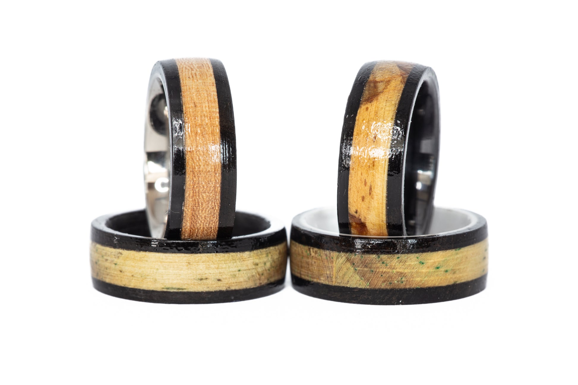 Each ring is delivered in a custom wooden ring box with a hinged, magnetic closure. The inside lid of the box is engraved with the origin of the wood used for the ring. Each ring also comes with a dated certificate of authenticity with individual serial identification numbers to prove the unique origin of the material used for your ring!