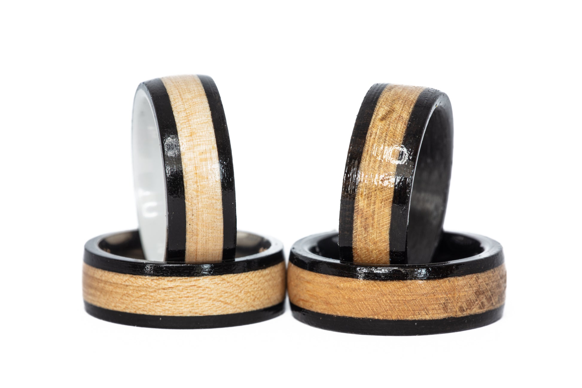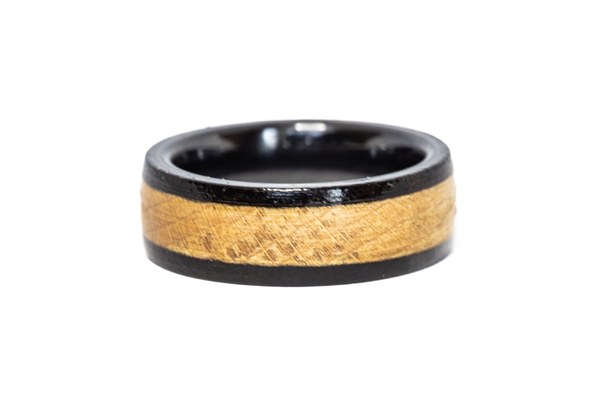 Each ring is delivered in a custom wooden ring box with a hinged, magnetic closure. The inside lid of the box is engraved with the origin of the wood used for the ring. Each ring also comes with a dated certificate of authenticity with individual serial identification numbers to prove the unique origin of the material used for your ring!