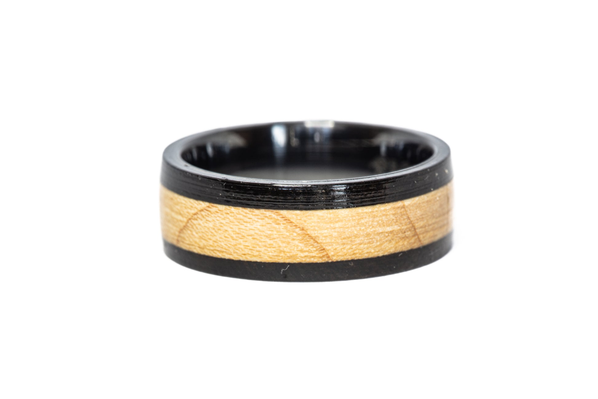 A piece of Michael Jordan's legacy with this ring made from the actual court used by the Chicago Bulls from 1987-1994, encompassing the first three of Jordan's titles! In 1994, The Bulls removed and replaced the floor, selling off small pieces as souvenirs to fans, collectors, and memorabilia stores. Our rings are made with a central core of the original Jordan/Bulls court, surrounded by dark black Gaboon Ebony wood, and supported by a comfort fit inner liner of your choice.