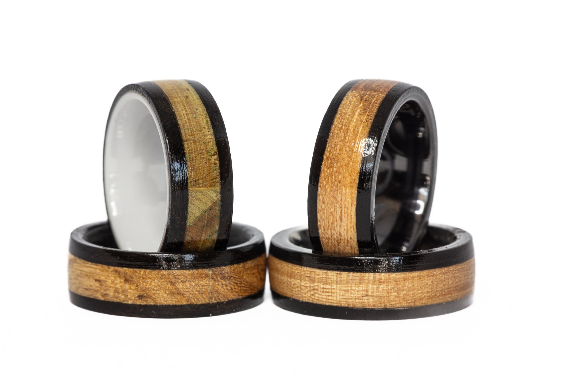 Each ring is delivered in a custom wooden ring box with a hinged, magnetic closure. The inside lid of the box is engraved with the origin of the wood used for the ring. Each ring also comes with a dated certificate of authenticity with individual serial identification numbers to prove the unique origin of the material used for your ring!