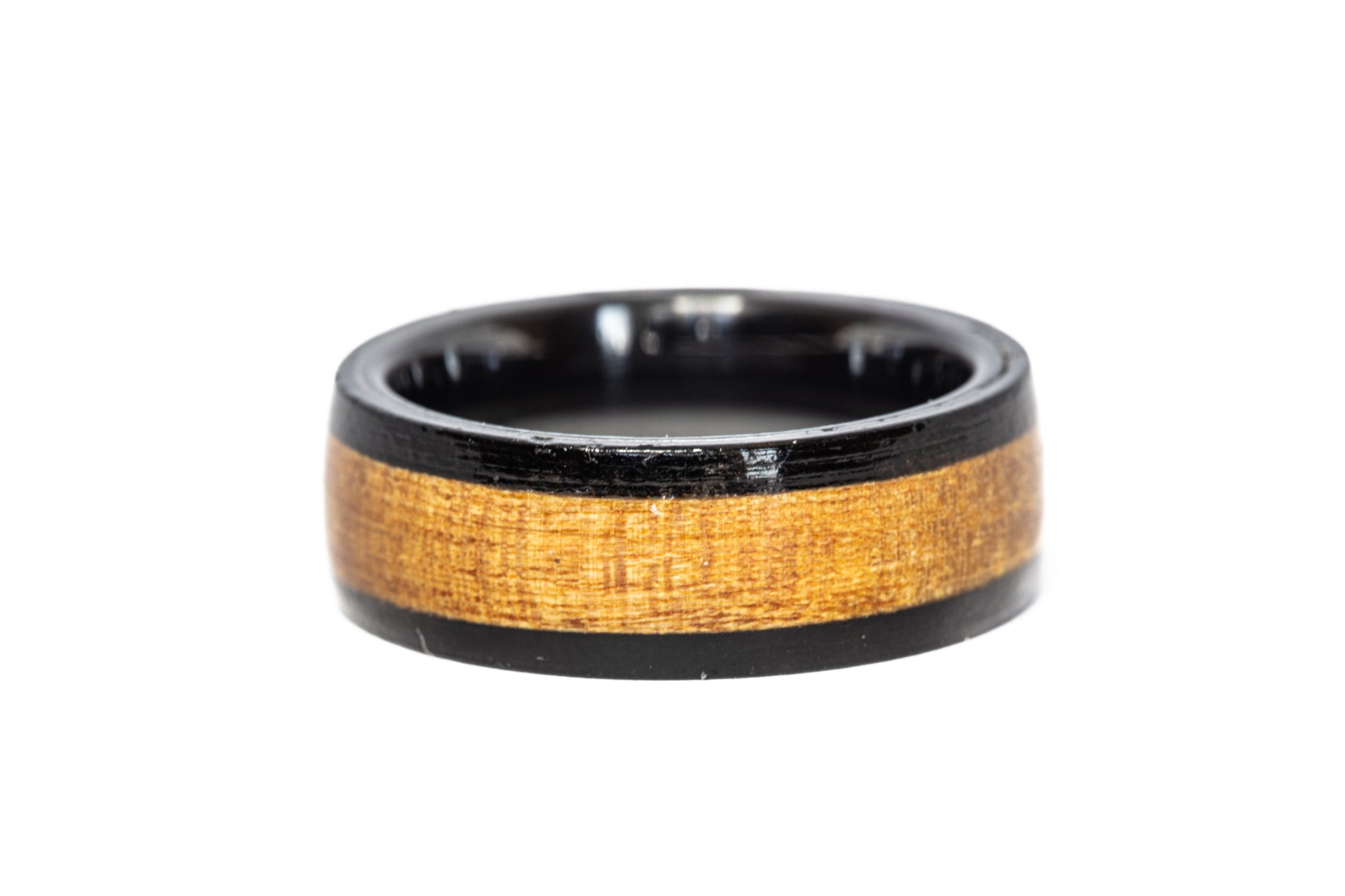 This ring is made from the wooden seats of Autzen Stadium, home of the Oregon Ducks football team since 1967. Due to its unique positioning atop an artificial landfill, the relatively small stadium boasts one of the loudest crowds in college football. After the Rich Brooks era, which brought new success to the team, Oregon has proven to be one of the top programs in college football, despite not having won a BCS Championship. Because of their relationships with Nike executives, the team is best known for their uniform combinations, boasting a new one each week during the season. Your ring is made with a central band of wood from the stadium seating, along with black Gaboon Ebony wood edges, and your choice of comfort fit inner liner.