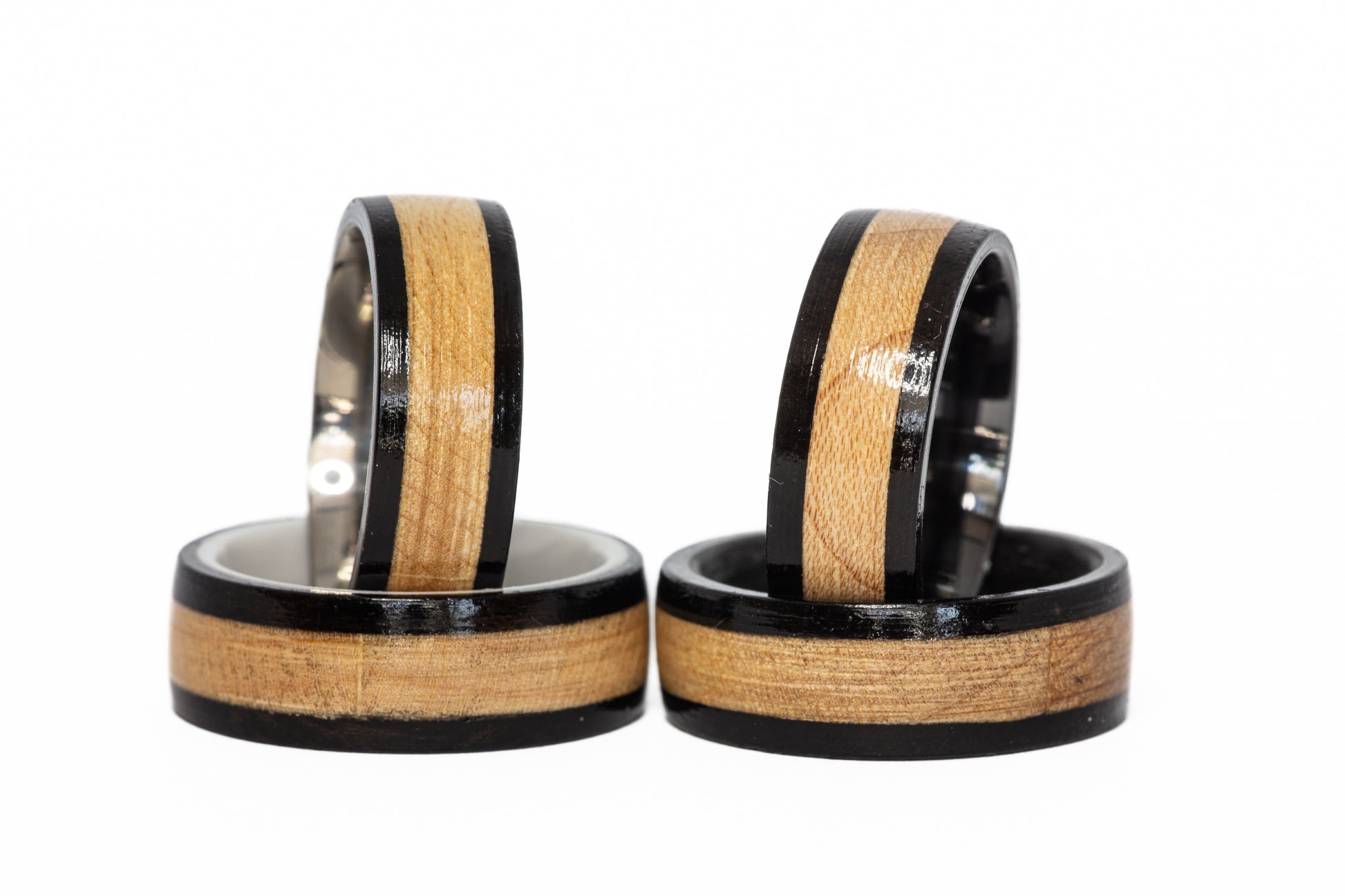 Each ring is delivered in a custom wooden ring box with a hinged, magnetic closure. The inside lid of the box is engraved with the origin of the wood used for the ring. Each ring also comes with a dated certificate of authenticity with individual serial identification numbers to prove the unique origin of the material used for your ring!